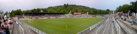 Das Dallenbergstadion (immerhin 17.000 Plätze) verfügt über eine überdachte Tribüne, wo man sich auf dem blanken Beton oder aber auf second-hand Sitzschalen vom Betze platzieren kann (ich weiß ja nicht, ob das so erstrebenswert ist, sich auf einen Sitz zu setzen, in den ein Pfälzer reingefurzt hat…). Ansonsten verfügt das reine Fußballstadion ringsum über Stehstufen.