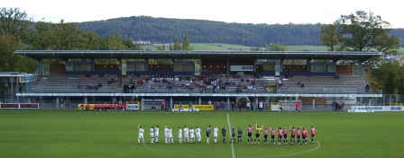 In Aalen machte ich mich dann zu Fuß zum Stadion, wovon die letzte Etappe tatsächlich durch dichten Wald zurückgelegt wurde, sehr fein. Der Name Waldstadion (schon das Dritte in dieser Saison) war also gerechtfertigt.