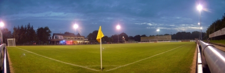 Ah, halt Platzrunde… also, beide Längsseiten verfügen über sagenhafte zwei Stufen auf voller Länge, hier und da stehen ein paar Parkbänke als Sitztribünensurrogat, und das Vereinsheim hat ne überdachte Terrasse zum Spielfeld… das wars.