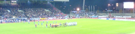 Das Stadion war gut gefüllt, die knapp 17.000 meines Erachtens zu niedrig, beide Tribünen waren sehr ordentlich gefüllt, die Südkurve war pickepacke voll. Nur in der Nord waren viele Lücken – etwas mehr Gäste hätte ich schon erwartet.