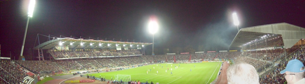 Da ich heute ja mal einigermaßen neutral unterwegs war (die Daumen wurden Hansa gedrückt, aber Tore und gutes Spiel waren wichtiger), postierte ich mich mal Richtung Kurve, um wenigstens ein wenig vom Heimsupport mitzubekommen – und da muss ich sagen, das war aller Ehren wert! Brutal laut und durchgängig! Schade, dass man das als Gästefan normalerweise nicht mitkriegt. Auf Hansaseite die Stimmung leider sehr enttäuschend, waren zwar beachtliche 400 Mann auf ‘nen Montag abend auf dem Katzensprung von der Ostsee ins Badische dabei, aber laut oder auch nur durchgängig ist etwas anderes.