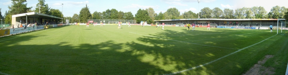 Der Fußballground besteht aus zwei flachen, überdachten Tribünen mit jeweils ein paar Betonstufen, von denen auf der Vereinsheimseite einige mit Sitzbrettern als Bänke dienen.
