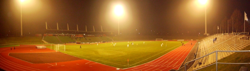 Am Ort des Geschehens ein kurzer Schreckmoment – das Flutlicht im Stadion war noch aus, dafür war der Kunstrasennebenplatz hell erleuchtet – OK, wäre für mich dann ein neuer Ground gewesen, aber das Parkstadion mit dem BTSV zu machen, ist ja mal auch nicht schlecht. Aber, keine Panik, es wurde im Stadion gespielt.